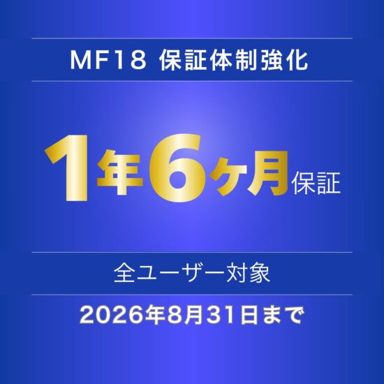 すでにMF18をご購入済みのお客様につきましても、従来の1年保証に6ヶ月を加え、保証期間を1年6ヶ月へ延長いたします。