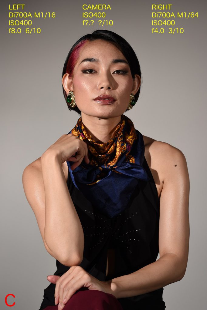 モデルの左(LEFT)のストロボの光量はずっと固定したまま、右(RIGHT)のストロボの光量だけをAから順番に1EVずつ減光します。