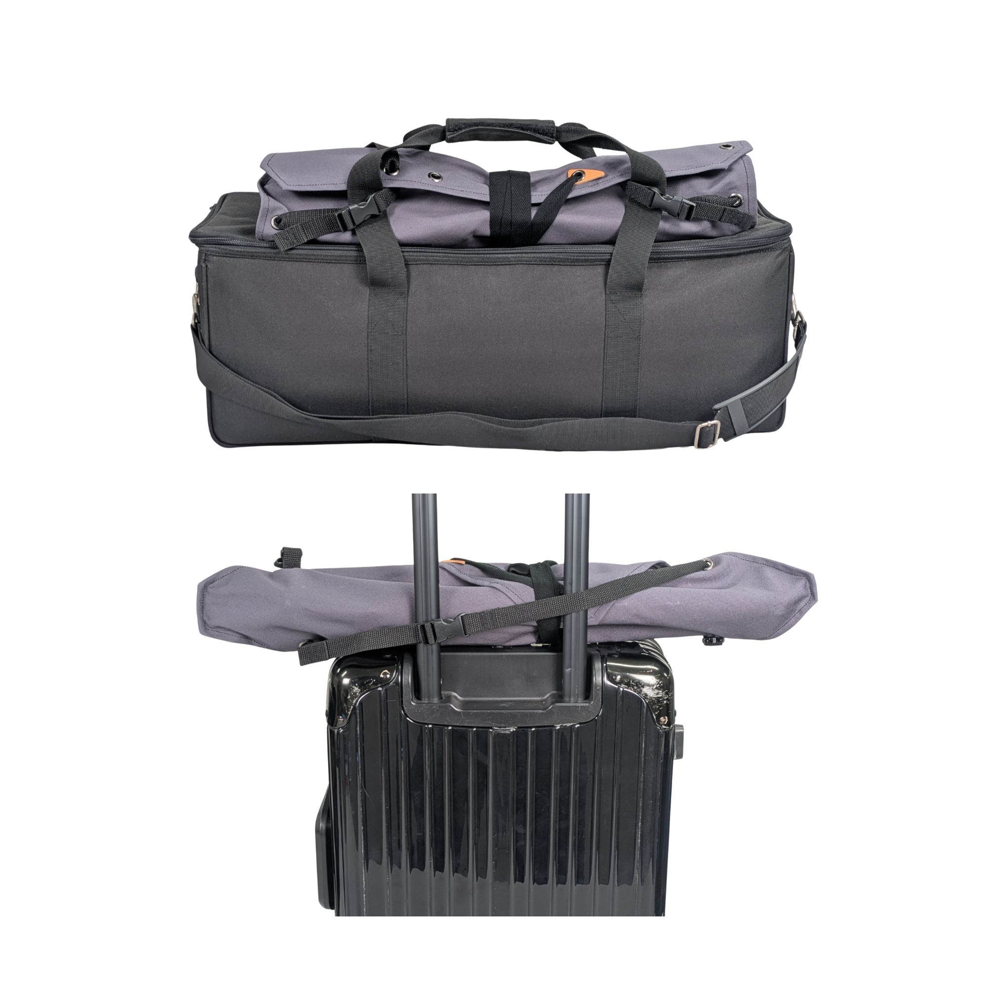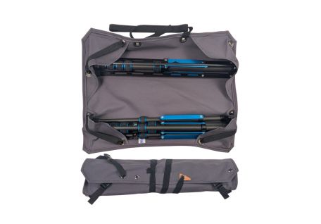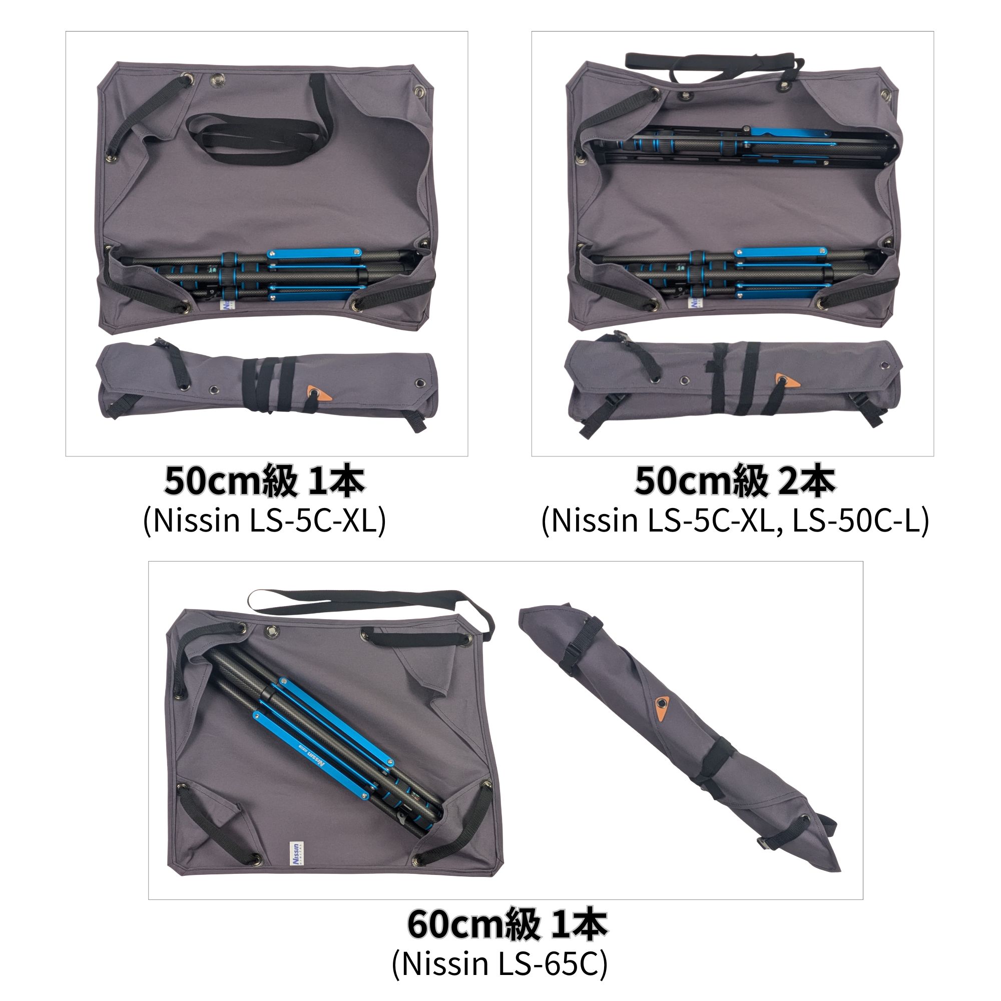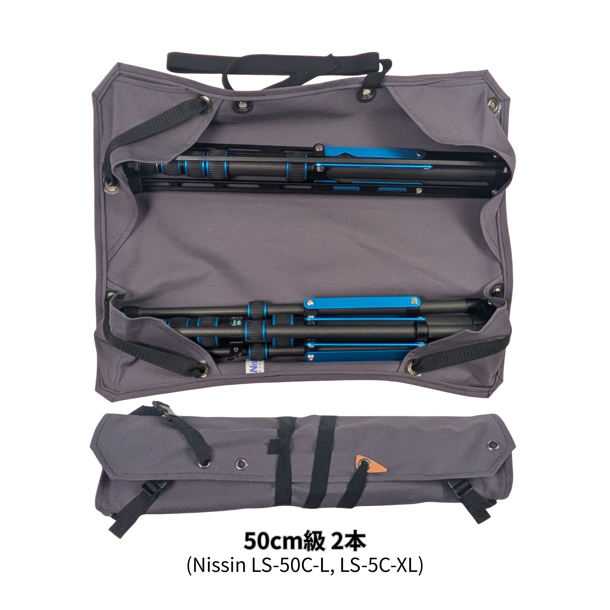 50〜60cmクラスのライトスタンドに対応したロールケース+ウェイトバッグです。バッグインバッグやアタッチバッグとしても利用でき、メインバッグへの連結や拡張が可能です。耐久性の高い帆布生地を採用したロールアップ(布巻き)タイプのため、収納量に合わせてしっかりフィットします。さらにストーンバッグ(ウェイトバッグ)としても活用でき、ライトスタンドの転倒リスクを軽減します。